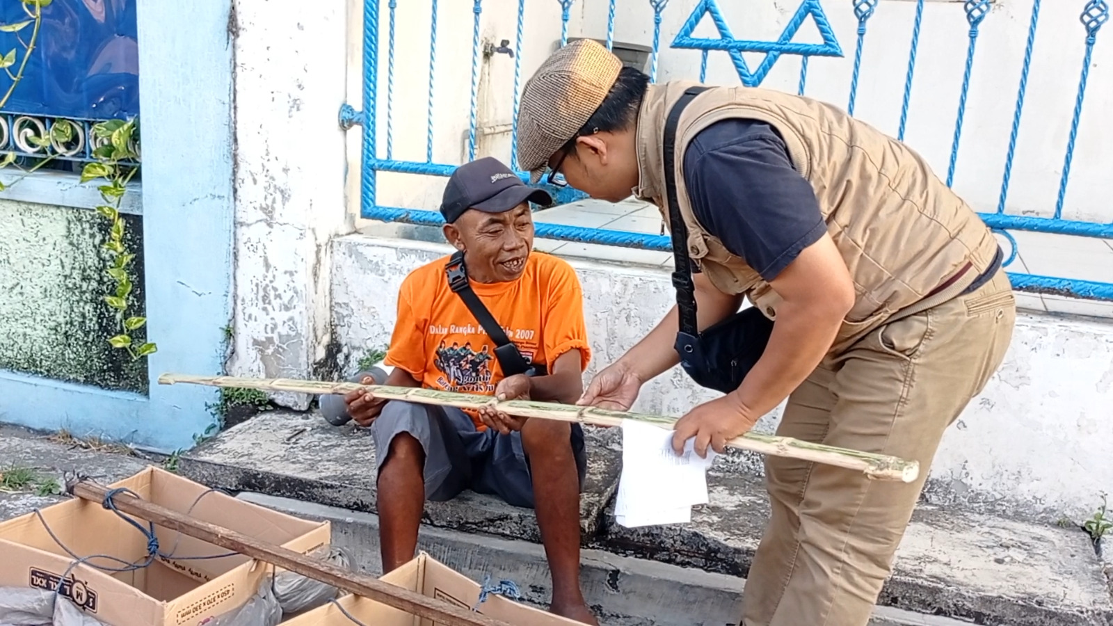 “Hari ini saya dan teman-teman sedang menyalurkan donasi dan bantuan alat pikul kepada Mbah Wardi. Saat itu saya ketemu di kawasan Kampung Baru dan saya melihat Mbah Wardi jalan sambil gemetar dan mengusap mata,” jelas Danar.