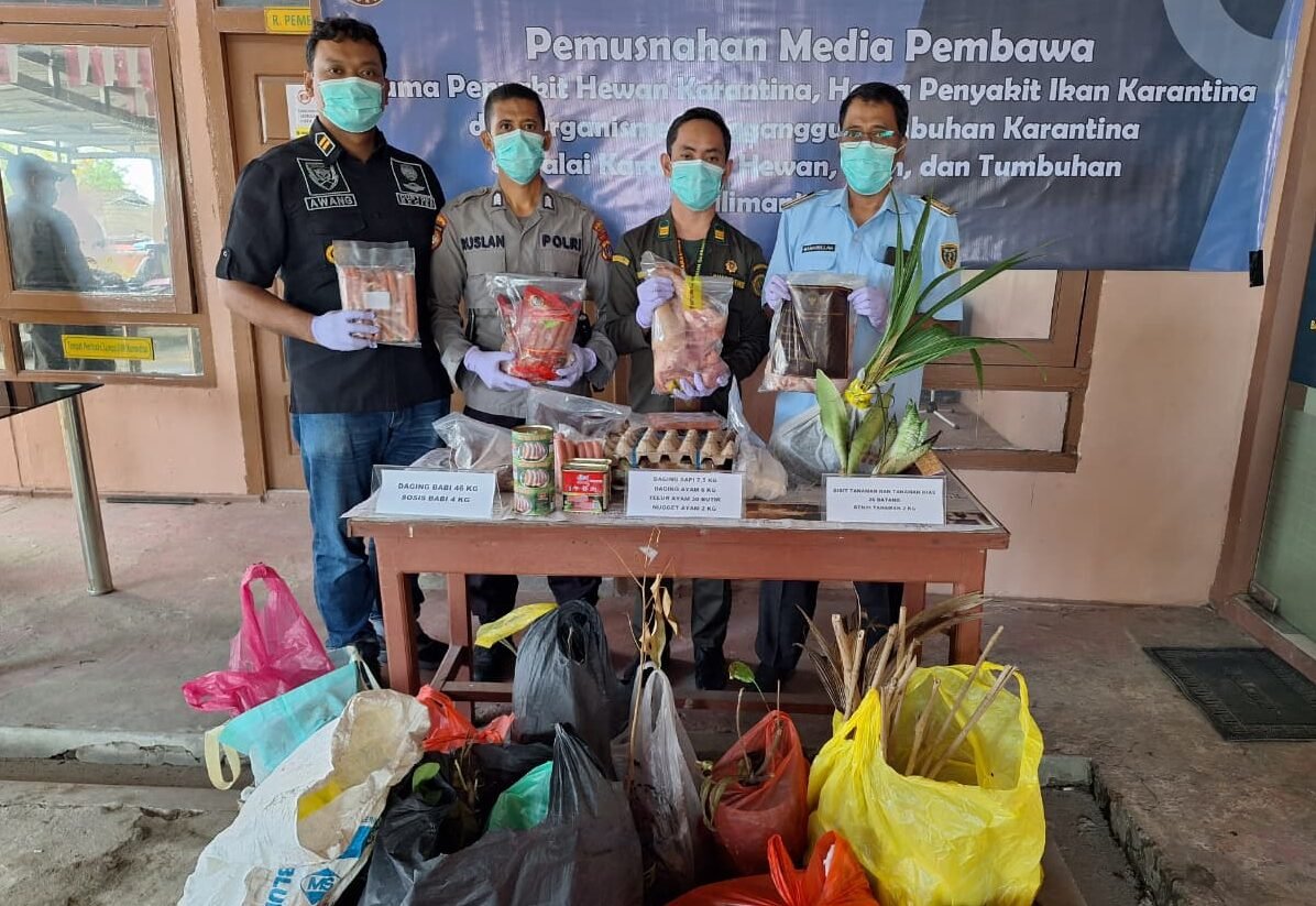Barang yang dimusnahkan mencakup 46 kilogram daging babi, 4 kilogram sosis babi, 7,5 kilogram daging sapi, 6 kilogram daging ayam, 30 butir telur ayam, 2 kilogram nugget ayam, serta bibit dan benih tanaman.