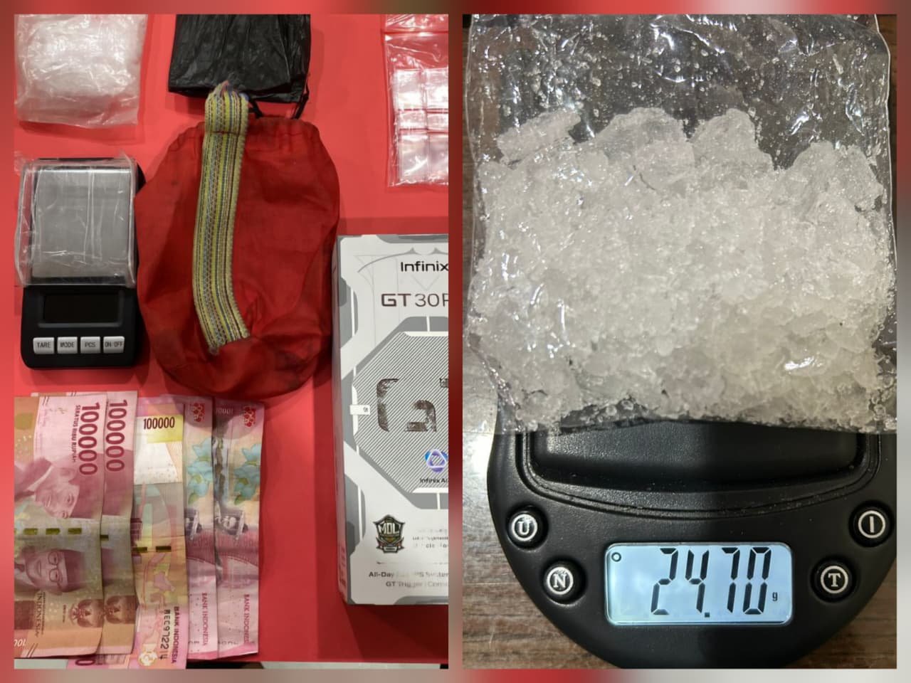 Barang tersebut ditemukan di bawah lemari pakaian milik tersangka dan diduga berisi narkotika golongan I jenis sabu dengan berat bruto sekitar 24,7 gram.
